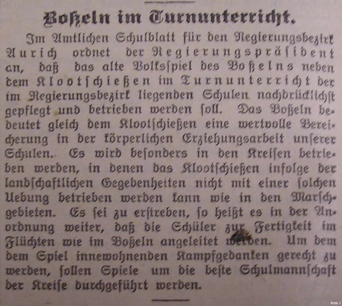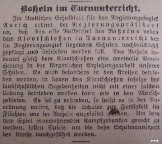 In Ostfriesland kam es Ende der 1930er-Jahre zu einer Förderung des Boßelsports an den Schulen, um für die Klootschießerbewegung auch in den bisher nicht erschlossenen Gebieten Anhänger zu finden.